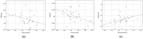 Correlation scatter plot of physiological and psychological responses: (a) HRV-Work concerns; (b) HF-Work concerns; and (c) LF/HF ratio-Personal burnout.