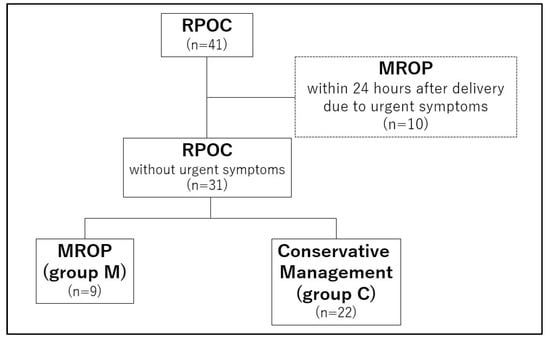 This study included 41 patients who delivered after 34 weeks of gestation and were managed for RPOC at Kindai University Hospital from January 2013 to March 2022. Ten patients underwent MROP within 24 h following delivery due to severe symptoms such as heavy bleeding and infection. The remaining 31 RPOC cases were divided into the following two groups: those who underwent MROP within 24 h of delivery without urgent symptoms (group M) and those who were managed conservatively without MROP (group C) (Figure 1). At the time of heavy bleeding, uterine artery embolization (UAE) was performed for hemostasis.