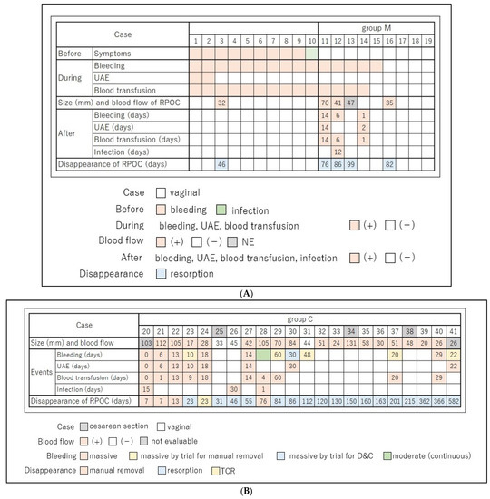(A). Clinical courses of 19 cases with placental removal within 24 h after delivery. The numbers in “Size and blood flow of RPOC” indicate the size of RPOC (mm). The numbers in “After” and “Disappearance of RPOC” indicate the duration from delivery to the onset of the events (days). RPOC, retained products of conception. (B). Clinical courses of 22 cases with conservative management. The numbers in “Size and blood flow of RPOC” indicate the RPOC size (mm). The numbers in “Events” and “Disappearance of RPOC” indicate the duration from delivery to the onset of event (days). RPOC: retained products of conception.