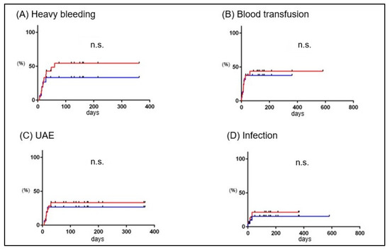 Regarding the timing, heavy bleeding occurred within 60 days postpartum in 22 cases with conservative management. Blood transfusion was required within 60 days postpartum, and UAE was required within 30 days postpartum. Infection occurred within 30 days postpartum (Figure 4A–D, red lines). Heavy bleeding, UAE, blood transfusion, and infection occurred within 40, 40, 20, and 30 days postpartum, respectively, in 16 cases, excluding 6 patients with hemorrhage in the placental removal trial (Figure 4A–D, blue lines).