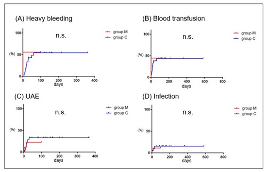 To determine the relative merit of MROP versus conservative treatment, we evaluated the cumulative incidence of events in 9 MROP cases without urgent symptoms (group M) and 22 conservative treatment cases (group C). The cumulative incidence of heavy bleeding, transfusions, UAE, and infections did not differ between these two groups (Figure 5A–D).
