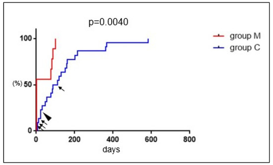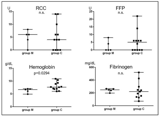 Heavy bleeding occurred in 5 (56%) cases in group M and 11 (50%) cases in group C, with no significant difference in frequency. The lowest hemoglobin level within 72 h after heavy bleeding was lower in group M than group C (median; 6.7 vs. 7.7 g/dL, p = 0.029), suggesting that massive bleeding occurred in a short period of time. There was no significant difference in the amount of blood transfusion and the lowest fibrinogen level within 72 h after heavy bleeding (Figure 6).