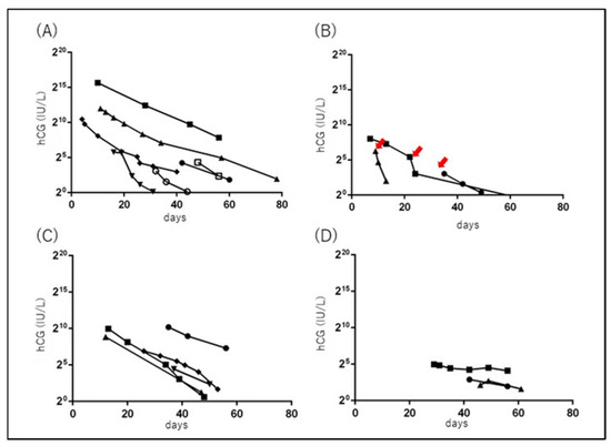 Serial changes in serum hCG. The horizontal and vertical axes indicate the duration from delivery to the measurement date (days) and the serum hCG level (IU/L), respectively. (A,B) RPOC cases delivered after 34 weeks of gestation. (A) Cases without UAE. (B) Cases with UAE. Arrows show the date on which UAE was performed. (C,D) RPOC cases delivered at less than 20 weeks of gestation and did not undergo UAE. (C) Cases with serum hCG half-life of less than 10 days. (D) Cases with serum hCG half-life of more than 10 days. RPOC: retained products of conception; UAE: uterine artery embolization; hCG: human chorionic gonadotropin.