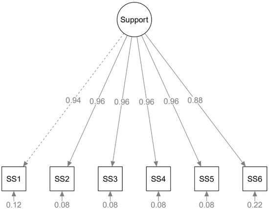 As described in the theory, a one-factor Support model was conducted. Figure 1 illustrates the CFA results for this model. It exhibited an adequate fit to the factor structure: RMSEA = 0.014 (95% CI: 0.000–0.047), SRMR = 0.008, CFI = 0.999, TLI = 0.998, standardised item-factor loadings ranged from 0.881 to 0.961.