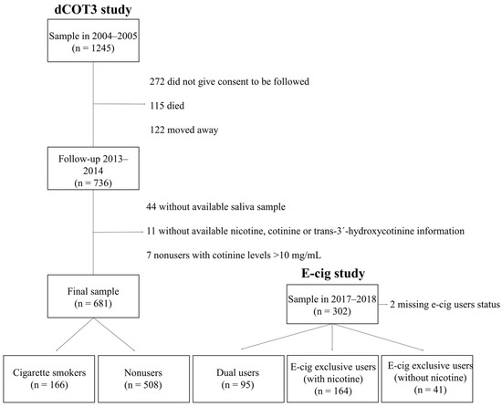 This is a pooled analysis carried out with data retrieved from two different studies. The first one was a longitudinal study on tobacco smoking patterns “Determinants of Cotinine project-phase 3 (dCOT3 study).” This was a cohort study of a sample of adults (≥16 years at baseline) from the general population of Barcelona (Catalonia, Spain). The baseline was carried out during the years 2004–2005 (n = 1245) and one follow-up was carried out during 2013–2014 (n = 736). The study included self-reported information about smoking patterns and tobacco exposure, and a saliva sample was collected at the follow up for the determination of various biomarkers of tobacco exposure. After cleansing the follow-up [24], removing subjects that did not have available saliva samples (n = 44), subjects without available nicotine, cotinine or trans-3′-hydroxycotinine information (n = 11), and seven nonusers whose cotinine concentrations were incompatible with being a nonuser (>10 ng/mL) [25], this sample retained data of 674 individuals. The second study was a cross-sectional study (n = 302) conducted in 2017–2018 containing data on adult (≥18 years old) users of e-cigarettes living in Barcelona. As an alternative to a probabilistic sampling technique, the consumer panels technique [26] was used in order to enroll users of e-cigarettes. Although this technique renders the sample unrepresentative of the general population, it minimizes the limitations of the reduced sample size, given the low prevalence of use in this population. Individuals who declared to be current users of e-cigarettes were asked to take part in the study. A questionnaire on e-cigarette use patterns was used and a saliva sample was also collected to determine nicotine, cotinine and trans-3′-hydroxycotinine. Two individuals whose information was missing and could not be categorized were excluded, rendering a second sample of 300 e-cigarette users. Thus, the final merged sample retained data of 974 individuals (Figure 1). The design and methodology of both studies are detailed elsewhere [25,26]. Both studies received approval by the ethics committee of the Bellvitge University Hospital (PR118/11 y PR133/15, respectively) and all participants signed informed consent.
