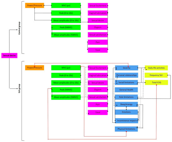 Schematic of results showing significant correlations in the control and SUI groups. Black lines represent positive correlations. Red lines represent negative correlations. Purple box: FSFI; Orange box: Power (pressure); Green box: sEMG; Blue box: KHQ; Yellow box: ICIQ.