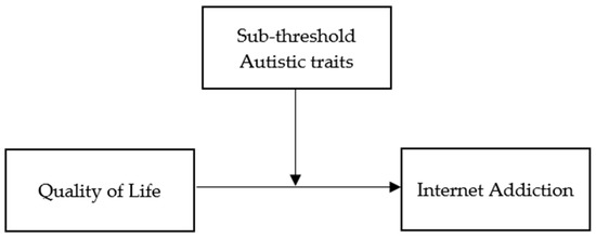 Therefore, the main goal of the present study was to investigate the relation between subthreshold autistic traits, quality of life, and the overuse of the Internet among university students. Considering the abovementioned theoretical premises, we hypothesized a decrease in IA risk as quality of life increases, with a moderating effect of SATs (Figure 1).