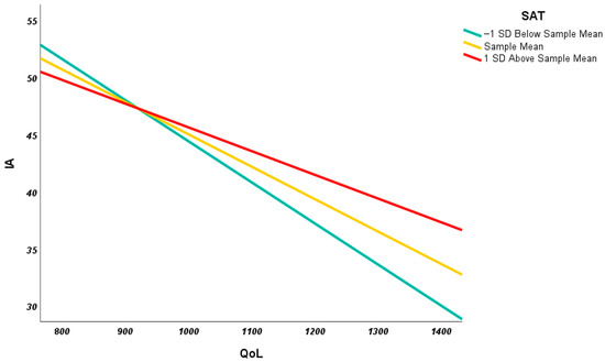 Relationship between QoL and IA at the high, average and low levels of SATs.