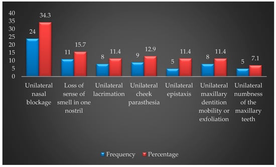 Furthermore, of the patients who presented with early clinical signs and symptoms, nasal obstruction was observed in 24 (34.3%), anosmia was observed in 11 (15.7%), paresthesia was observed in nine (12.9%), numbness of the teeth was observed in five (7.1%), and epistaxis was observed in five (11.4%) (Figure 1). Of the patients with late clinical signs and symptoms, a palpable mass in the buccal sulcus was observed in 65 (92.9%), lymphadenopathy was observed in 24 (34.3%), paresthesia was observed in 38 (54.3%), and diplopia was observed in 22 (31.4%).