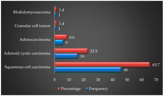 As presented in Figure 2, squamous cell carcinoma, which was the most common malignancy, was encountered in 46 patients (65.7%), while adenoid cystic carcinoma was found in 16 patients (22.9%).