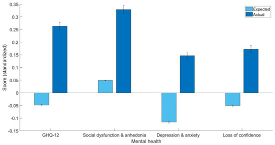 The estimates of the general linear models trained on healthy controls can be found in Table 3. The current study found that arthritis patients have poor overall mental health as indicated by the GHQ-12 summary score (t(5587) = 21.17, p < 0.001, Cohen’s d = 0.31, 95% C.I. [0.28, 0.34]), GHQ-12A (t(5587) = 18.87, p < 0.001, Cohen’s d = 0.28, 95% C.I. [0.25, 0.31]), GHQ-12B (t(5587) = 19.25, p < 0.001, Cohen’s d = 0.26, 95% C.I. [0.24, 0.29]), GHQ-12C (t(5587) = 15.59, p < 0.001, Cohen’s d = 0.22, 95% C.I. [0.19, 0.25]). The mean and standard error of predicted and actual standardized scores can be found in Figure 1.