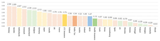 In order to compare changes in elderly populations and elderly dependency ratios for each type, we reviewed the rates of increases and decreases in elderly populations and elderly dependency ratios in 2020 compared with those in 2010. The OECD average ratio of the elderly population increased by 21.1%, and the elderly dependency ratio increased by 24.5%. Tax, health insurance, and LTC insurance revealed no significant difference in the rate of increase in the proportion of the elderly population in each group.