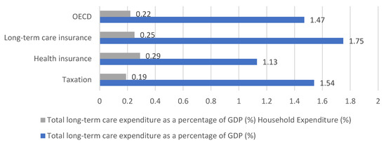Total long-term care expenditure and household expenditure as a percentage of GDP [18,25].