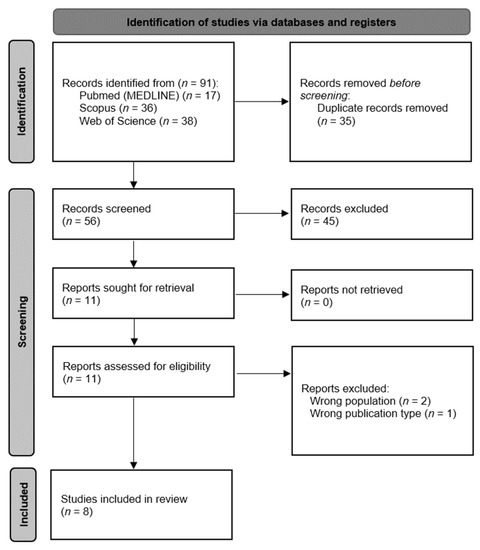 The database search resulted in a total of 91 articles, which were revised to identify duplicates, discarding 35 and leaving 56 unique articles. After a title-and-abstract screen, 11 potentially eligible articles remained. Finally, only eight articles [21,22,23,24,25,26,27,28] met the eligibility criteria established for this review (Figure 1).