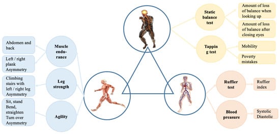 Tests and measurements were divided into three groups according to the complex systems [26,27] approach, where the human body consists of three main parts: cardiovascular, muscular, and nervous systems. By this theory, tests and exercises were split into three parts, as shown in Figure 1. In the muscular system, muscle endurance, leg strength, and agility are evaluated. The nervous system evaluation process consists of static balance and tapping tests. Finally, in the cardiovascular system, the Ruffier test [28] and blood pressure measurements are considered.