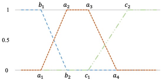where a 1 ,   a 2 ,   a 3 ,   a 4 or b 1 ,   b 2 or c 1 ,   c 2   are the membership value for each input, x. The side membership functions are represented in (2) and (3) formulas as a left and right curve, respectively. Both curves consist of three linear functions. The graphical representation of all possible membership functions is shown in Figure 2. It should be noted that each feature has both side membership functions (left and right) and one or three trapezium functions.