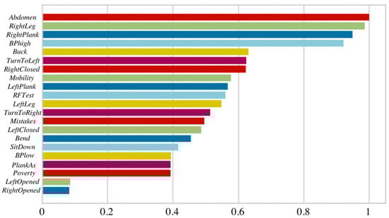 At the beginning of this research, the Random Forest model was constructed and applied to all 21 features at once. The importance of each feature was estimated using entropy [34], where values below 0.05 are considered as not statistically significant and could be removed from the model. According to the obtained results, only variables that belong to the muscular system are considered as important in the RF model (see Figure 5) and cardiovascular, together with neural systems, are not included. This may lead to incorrect health evaluation due to lack of features from other human body systems that are essential in the work ability evaluation process.