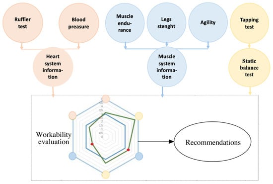 Previous studies have indicated what affects work ability in general. The research in Finland revealed that employees at ages 30–64 years are mostly affected by health and work environment-related causes [35,36]. Thirty-three percent of work ability is affected by physiological requirements, mental tension, and support. It was noticed that to improve work ability, employers should focus on employees’ health, and interventions should occur even at younger ages [37]. Other studies indicated that common health behavior in recent years was influenced by COVID-19 due to lockdown and social distancing, which caused changes in physical activity [38]. According to these and similar research it could be noticed that physical and mental health are the most important factors in work ability evaluation systems. The same conclusions were obtained in [39], where suggestions were proposed considering that physical exercises via online channels could help to maintain people’s physical activity while they either had to or preferred to stay at home. However, previous studies are mostly focused on individual interviews, various questionnaires that contained conceptual information about individual health state and might change according to question formulation, specialist competence, and other aspects [6,15,16,17,18]. In this paper, the work ability was mostly related to the employee’s physiological state, which consists of three separate systems: cardiovascular, muscular, and neural. Each state consists of several exercises or tests that need to be performed one after another.