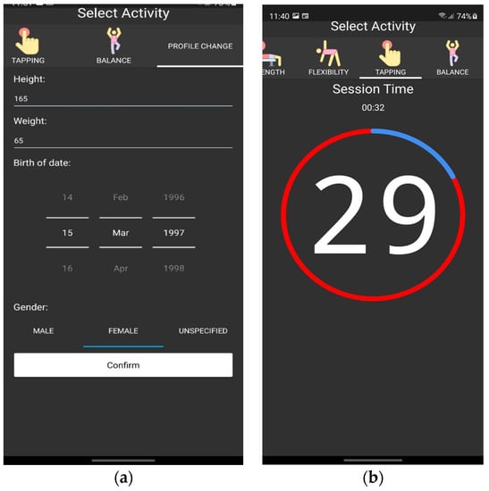 Figure 8. Mobile app: (a) registration form; (b) an example of evaluation process.