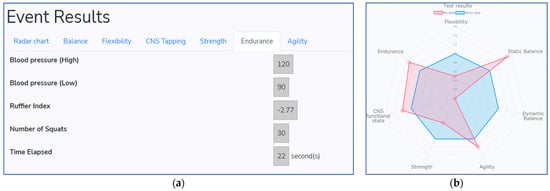 Figure 9. An example of the specialist client device results: (a) statistics of the event; (b) evaluation results presented as a hexagon web.