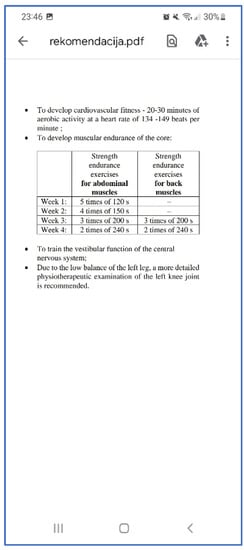 An example of listed recommendations to improve work ability is presented in Figure 10. This information is provided in a Portable Document Folder (PDF) format in the client and specialist devices. The training plan is prepared for the 4 week period, and the same tests should be repeated in that time. Furthermore, if there are possible serious health indications, the program suggests contacting the doctor for further investigation to avoid accidents in the workplace.