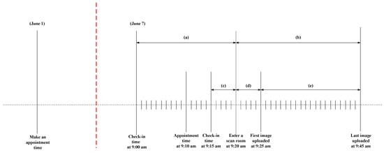 The current appointment scheduling policy of the case hospital uses the constant arrival policy, wherein each patient is scheduled for 20 min of scan time. Outpatients and inpatients are scheduled for eight and six types of ultrasound scans, respectively. Figure 1 explains how the system works in the hospital. As observed in the figure, a patient goes to the hospital on 1 June to make an appointment for 9:10 am on 7 June. The patient returns to the hospital for the scheduled appointment on 7 June. Upon arrival, the check-in time of the patient is recorded; the check-in time can be earlier (i.e., 9:00 am) or later (i.e., 9:15 am) than the appointment time depending on the patient’s arrival. If the patient arrival time is 9:00 am (i.e., early patient) and the scanning room is available at 9:20 am, the total patient waiting time is denoted by (a), which is 20 min. If the patient arrival time is 9:15 am (i.e., late patient) and the scanning room is available at 9:20 am, the total patient waiting time is denoted by (c), which is 5 min. The patient’s scan time starts when the patient enters the scanning room at 9:20 am and continues until the final upload of the scan image is conducted at 9:45 am. Therefore, the total time of patients in the scanning room is denoted by (b), which is 25 min. The total service scan time includes the preparation time (i.e., 5 min denoted by (d)) and the service time (i.e., 20 min denoted by (e)).