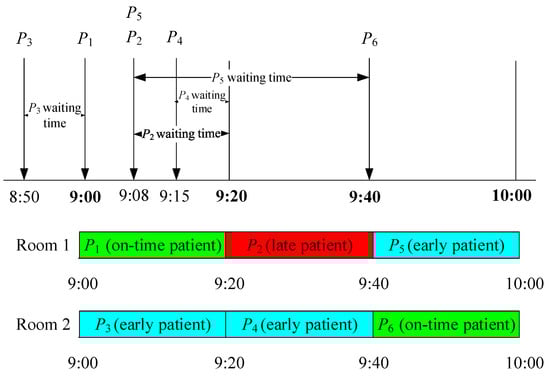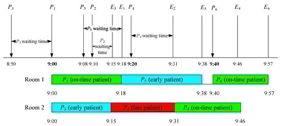 For the constant service time example, all patients’ service time is assumed to be 20 min, and two scanning rooms are scheduled. For notations, Pi is the arrival time of the ith patient, and Ai is the scheduled appointment time of the ith patient. In Figure 2, P3, who has an appointment time at 9:20 am, arrives at 8:50 am; P1 then arrives at exactly 9:00 am (i.e., the scheduled appointment time), which means that P1 is on time. As P2 has not arrived yet and there is still one room available, P3 is preempted. At 9:08 am, P2 and P5 arrive; after 7 min, P4 arrives. Since the service starts at 9:20 am and P4’s scheduled appointment time is 9:20 am, P4 receives the service at the scheduled appointment time. P2 also receives the service at 9:20 am given the patient’s earlier scheduled appointment than P5, even though P2 is late and P5 is early. In this case, P5 receives the service at 9:40 am (i.e., the scheduled appointment time), as well as P6 since P6 is on time. The details of appointment time, arrival time, start of service time, end of service time, and waiting time for each patient are summarized in Table 11.