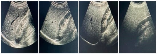 A radiologist evaluated the presence and staging of NAFLD through transabdominal ultrasonography (USG) (Acuson Sequoia 512, Siemens, Washington, DC, USA). The criteria of the Turkish Gastroenterology Association were used for the diagnosis of the fatty liver through USG. Hepatic echogenicity typically consists of measurements of the echo difference between the liver and kidneys, evaluation of echo penetration into the deep part of the liver, and determination of the clarity of blood vessel structures. The degree of lipoidosis severity was evaluated clinically as used in daily practice by dividing it into four classes. The ultrasonography findings in hepatic steatosis are presented in Figure 1 (Figure 1). Grade-0: no lipoidosis; grade-I: mild NAFLD; grade-II: moderate NAFLD; grade-III: severe NAFLD [14,15,16]. All parameters were compared between these groups, and the association between NAFLD and dynapenia in diabetic men was evaluated.