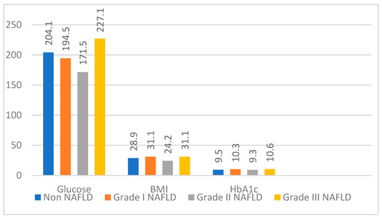 Fasting glucose (n = mg/dL), BMI (n = n) and HbA1c (n = %) measurements according to NAFLD stages (NAFLD: Non-alcoholic fatty liver disease; BMI: Body mass index).