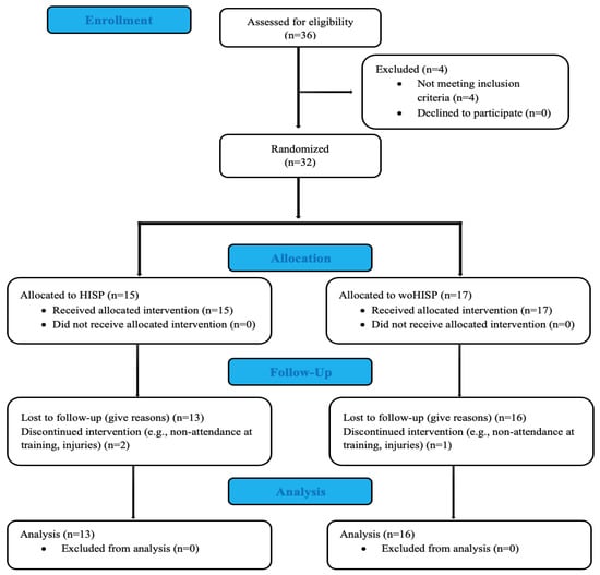 This study was conducted with a cross-sectional design. An initial power analysis (G*Power, University Duesseldorf, Duesseldorf, Germany) was performed to determine the sample size [20]. A total of 29 players were separated into two groups, both of which comprised elite soccer players: HISP (n = 13, age: 23.5 ± 3.1, height: 177.8 ± 5.1, weight: 72.8 ± 3.7, body mass index: 23.1 ± 1.9) and woHISP (n = 16, age: 20.6 ± 1.4, height: 178.4 ± 6.1, weight: 72.5 ± 8.7, body mass index: 23.2 ± 2.9). The inclusion criteria were as follows: (i) all physical evaluations conducted before the start of the season; (ii) no injuries at the time of the evaluations; and (iii) no injuries in the month prior to the evaluations (Figure 1). The HISP included the ICSD criteria to compete, a minimum hearing loss of 55 dB in the better ear or both ears, and being active athletes of the Turkish Deaf Sports Federation, competing at the national level at the time of the study. However, the HISP group had European, World and Olympic champions and medal-winners.
