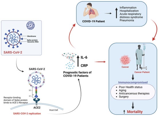 Cancer patients are generally immunocompromised, and COVID-19 infection may have worse outcomes than non-immunocompromised individuals. Specific biomarkers associated with severe COVID-19 illness in cancer patients include C-reactive protein (CRP) and interleukin (IL)-6. CRP and IL-6 levels may be helpful in the prognosis of COVID-19 infection (Figure 1). In this regard, CRP levels greater than 10 mg/dL were reported to be significantly associated with higher odds of COVID-19-related mortality (13.56, p = 0.03) in patients with leukemia, myeloma and lymphoma []. Similarly, IL-6 levels were also increased in severe COVID-19. Blocking IL-6 in cancer patients was previously reported to be beneficial when combined with other conventional therapies []. Tocilizumab, an anti-IL-6 antibody [], can help decrease inflammation and mortality in COVID-19 subjects []. However, blocking this pathway could also increase the immunocompromised state and secondary infection [].