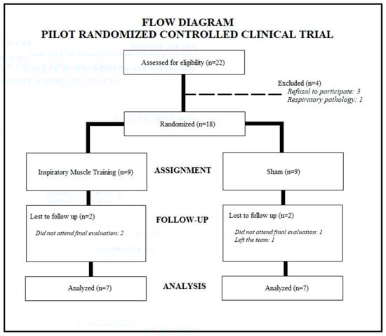 In a recent case–control study, we found that greater values of inspiratory muscle strength are associated with shorter path length and less lateral displacement in the closed eyes condition in a sample of soccer players [20]. This association may lead to the hypothesis that a specific IMT program in soccer players could improve their postural stability. Data supporting or rejecting this hypothesis are, however, scarce in these populations. In previous literature reviews encompassing different types of players and specifically involving soccer players, none of the included randomized controlled trials (RCTs) examined variables related to balance [21,22]. Thus, the primary objective of this study was to assess the effect of IMT on static balance, and secondarily, to examine changes in the respiratory muscle function.