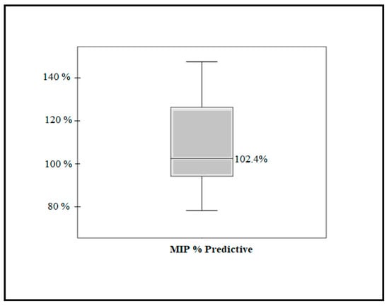 Regarding the inspiratory muscle strength (MIP% predictive) at baseline, the mean predictive percentage of the fourteen players (total sample) was 108.1% (96.30–120.0; 95% CI). A total of 25% of the players presented average values below their normality, that is, below 100% of the predictive one. On the other hand, 50% showed predictive values on the borderline value of normality, with an average of 102.4% (Figure 2).