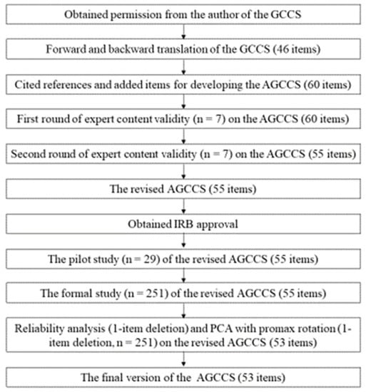 Figure 1 illustrates the study procedure. After permission was obtained from the author of the GCCS, forward and backward translation of the 46-item GCCS was conducted. Then, the 51-item AGCCS was developed based on cited references and through the revision of items [5,17,18]. First and second rounds of expert content validity review were conducted.