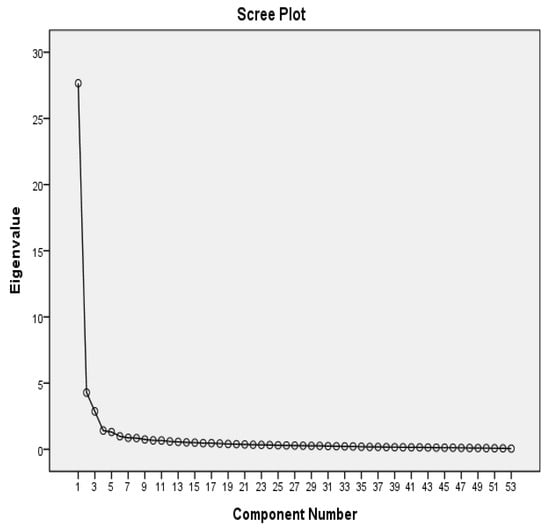 Rather than principal axis factoring (PAF) and PCA with promax and direct oblimin, we used PCA with promax rotation, with an oblique solution for the rotation, because most item–item correlations were >0.30. [25] The KMO measure was 0.965, and the MSA of individual items ranged between 0.884 and 0.987 (i.e., >0.60) [25]. The Bartlett test of sphericity was significant (p < 0.001). These values indicate sampling adequacy and initial factor extraction. The 25 Factors 1, 2, 3, 4, and 5 explained 52.18%, 8.08%, 5.40%, 2.67%, and 2.47% of the variance, respectively; moreover, all five factors explained 70.81% of the total variance. Factor 1 explained 50% more variance than the other four factors. Although factors 3, 4, and 5 explained <5% of the variance, their eigenvalues were >1. In addition, the scree plot in Figure 2 presents all five factors [25]. We also reported the pattern and structure matrices for obliquely rotated solutions and named the five factors according to their items [25].