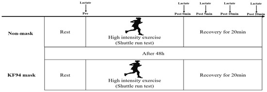 Although there did not appear to be any difference in blood lactate level during high-intensity exercise (incremental exertion bicycle test) while wearing an N95 face mask and without a mask [23], to date, few studies have examined physiological indicators in the recovery phase after exercise while wearing a mask. Therefore, this study aimed to quantify, in detail, the effect of KF94 face masks on changes in lactic acid during recovery after high-intensity aerobic exercise.