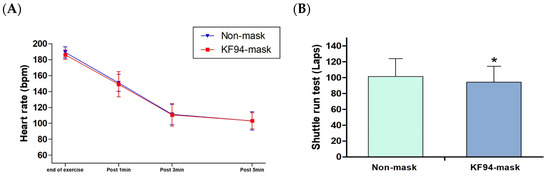 Effects of wearing a KF94-mask compared to no mask on heart rate and shuttle run test. (A) Heart rate; (B) shuttle run count. * Indicates significant differences (p < 0.05).