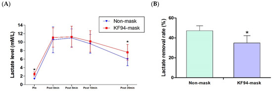 Each subject evaluated lactic acid for a 20 min recovery time with a non-mask and a KF94 facemask after maximum exercise, and blood sample was evaluated for a 20 min recovery time with a non-mask and KF94 facemask after maximum exercise. Capillary blood lactate (mmol/L) was drawn from the finger (20 µL) before, immediately after, and 5, 10, and 20 min after the interruption of exercise to assess the lactate concentration (Biosen C-Line Lactate analyzer, EKF Diagnostics, Cardiff, UK). The blood lactate removal rate (LArr) was calculated from the resting value (LAmax) measured during the test to the lactate concentration of 20 min of following exercise (LA20 min) (i.e., LArr = [LAmax – LA20 min/LAmax – LArest] × 100). Heart rate (HR) was observed at the first 5 min of the recovery period.