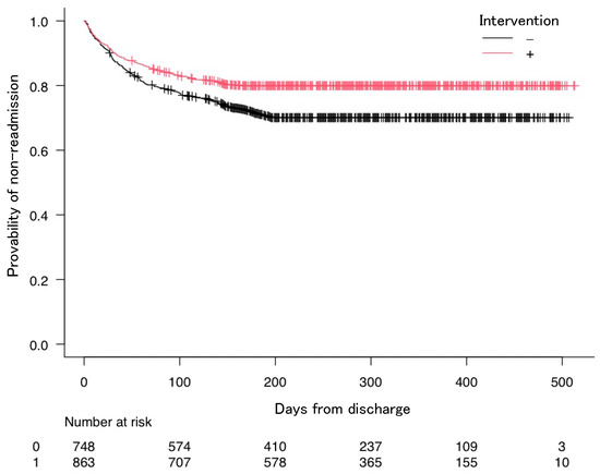 Data were descriptively summarized by dividing the participants into two groups. Based on the test of normality, Student’s t-test was performed on parametric data, and the Mann–Whitney U test was performed on non-parametric data. Based on previous studies and the averages of variables, numerical variables were dichotomized as follows: CCI (≥5 and <5) [50] and care level (≥1 and 0), based on the burden on caregivers and families [49]. The dependent condition was defined as care level ≥1. A significance level of p < 0.05 was used for all the comparisons. The participants were divided into two groups based on whether they received an oral intervention (intervention and control). To investigate the statistical difference in their readmission rate of 0.1, a minimum of 219 participants were required in each group based on α (alpha) = 0.05, β (beta) = 0.20, power of 80%, and mortality rate in the intervention group of 0.1 [11]. Variables reported to be significantly associated with hospital readmission in previous studies were selected and analyzed using the Cox proportional hazards regression model to determine the independent predictors of readmission following discharge. A Cox proportional hazards model adjusted for independent factors was used to calculate the hazard ratios (HR) and 95% confidence intervals (CI). Cumulative event-free survival rates were calculated using the Kaplan–Meier method and analyzed using the log-rank test. Patients with missing data were excluded from the analysis. All the statistical analyses were performed using EZR (Saitama Medical Centre, Jichi Medical University, Saitama, Japan), a graphical user interface for R (The R Foundation, Vienna, Austria) [52].