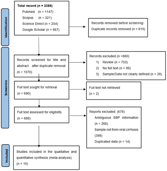 Studies with designs including retrospective studies, cross-sectional studies, prospective studies, case-control studies, and randomized clinical trials were included. Only original research that reported SBP in viral-related cirrhosis was included in this study. We excluded all reviews, short communications, commentaries, editorials, studies that reported SBP in alcoholic cirrhosis, studies that did not report SBP in viral-based cirrhosis, studies that reported ambiguous SBP information contained duplicated data, and studies that reported SBP in viral-based cirrhosis. Still, without clarity of the number of examined population, all studies with insufficient information (no clear description of the detection method, type of sample, period of sampling, viral cirrhosis record, country of study) and studies whose full text could not be retrieved.