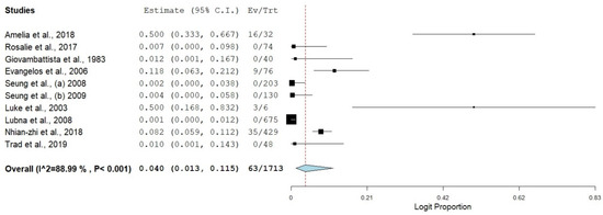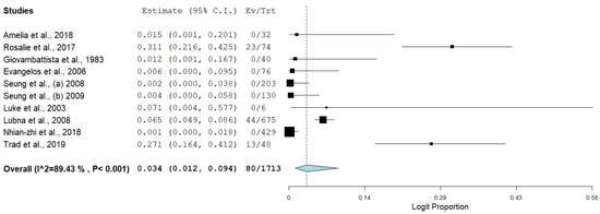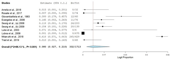 A forest plot was constructed to know the estimated weight of each study, its effect sizes, the proportional prevalence, the confidence interval of the estimated prevalence and the degree of heterogenicity [15]. Then, all data were transformed using logit transformation.