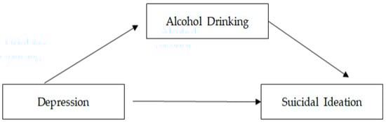 The data collected in this study were analyzed using the SPSS/WIN 27.0 program. The statistically significant level was 0.05. The values of frequency, percentage, mean, and standard deviation were calculated to measure the subjects’ general characteristics, depression, alcohol drinking, and suicidal ideation. To identify the differences in general characteristics, a t-test and one-way analysis of variance were performed, and the Scheffé test was conducted as a post hoc test. The correlations between the subjects’ depression, alcohol drinking, and suicidal ideation were analyzed using Pearson’s correlation coefficients. Hierarchical regression analysis was performed to analyze the factors influencing the subjects’ suicidal ideation. The mediating effect of alcohol drinking on the relationship between the subjects’ depression and suicidal ideation was analyzed using the multiple regression analysis-based three-step mediation analysis approach of Baron and Kenny []. The Sobel test was conducted to determine the statistical significance of the mediating effect.