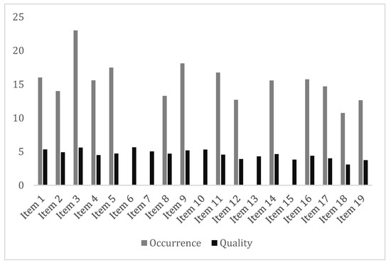 The MBT-G-AQS overall score for occurrence was 15.46 ± 4.65 SD and for quality was 4.60 ± 0.9. As shown in Table 5 and Figure 1, item 3, “Initiating and fulfilling turn taking”, was the most recurrent with a quality score of 5.6 ± 1.17 (Table 5, Figure 1). The MBT-G-AQS scale reliability was confirmed by an alpha coefficient > 0.85 both in the occurrence and in the quality of items.