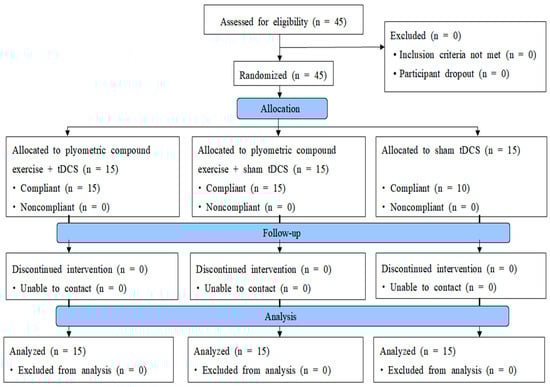 This study was conducted with 45 healthy adults in their 20s and 30s who were enrolled at the Y Academy in Noryangjin, Seoul, Korea. The participants understood the present study and consented to participation. They were classified into the following three groups: the Experimental Group I (n = 15; plyometric compound exercises + tDCS), Experimental Group II (n = 15; plyometric compound exercises + sham tDCS), and Control Group (n = 15; received sham tDCS). The results were analyzed using G*Power software (version 3.1.9.7) []. Based on the software power analysis (effect size = 0.5, significance level = 0.05, statistical power = 0.80), 42 participants were initially included, and 45 participants were finally included. Groups were created using randomization software (random allocation software program for windows 2.0, Isfahan University of Medical Sciences, Isfahan, Iran). At Y Academy located in Noryangjin, Seoul, the indoor temperature of the sports room was maintained at 25 degrees from 1 August 2023 to 15 September 2023. The intervention of the examinees was carried out in comfortable short-sleeved shirts. The experiment was conducted in a quiet room to minimize environmental distractions, and the environment was kept the same for the pre- and post-test.
