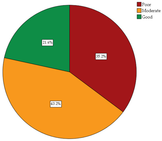 The mean knowledge score was 17.69 ± 4.55 (95% CI 17.24–18.14) out of a total knowledge score of 26. Overall, the frequency of students with good, moderate, and poor knowledge was 21.6%, 43.2%, and 35.2%, respectively (Figure 2).