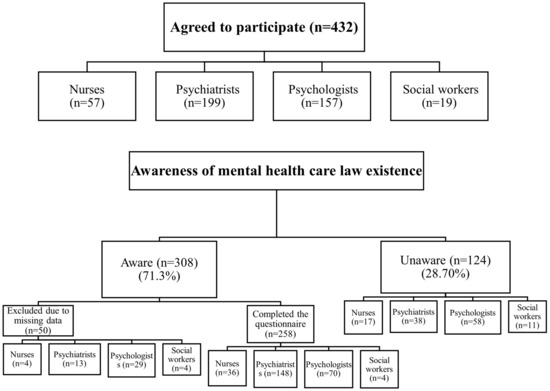 Of the 432 people who agreed to participate in this study, 308 (71.3%) were aware of the SMHL, and 124 (28.70%) were unaware. Among those who were aware of the legislation, 50 were excluded from further analysis of the MHLAS scores because of incomplete responses to the survey in section three (MHLAS) and beyond, representing (11.57%) of the total sample (432) and (16.23%) of those aware of the legislation (Figure 1). Psychiatrists showed the highest percentage of awareness of the SMHL at 161 (80.90%), followed by nurses at 40 (70.18%), psychologists at 99 (63.06%), and social workers at 8 (42.11%).