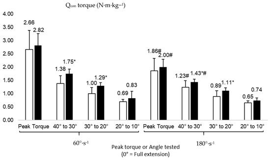 Concentric peak torque and angle-specific torque values of the quadriceps (Qcon, N·m·kg−1) in cases (white) and controls (black). #: significantly different from 60°·s−1 at the same angle p < 0.05; *: significantly different from cases at the same angle (or peak torque), p < 0.05.