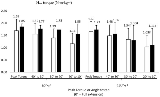 Eccentric peak torque and angle-specific torque values of the hamstrings (Hecc, N·m·kg−1) in cases (white) and controls (black). #: significantly different from 60°·s−1 at the same angle p < 0.05.