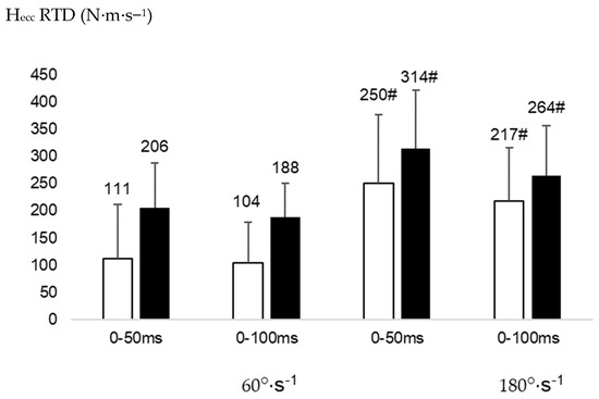 Rate of torque development (RTD) for the hamstrings eccentric (Hecc) contractions (N·m·s−1) between cases (white) and controls (black). #: significantly different from 60°·s−1 for the same time frame p < 0.05.