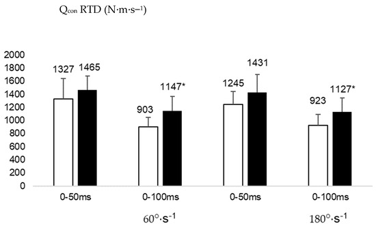 Rate of torque development (RTD) for the quadriceps concentric (Qcon) contractions (N·m·s−1) between cases (white) and controls (black).*: significantly different from cases for the same time frame, p < 0.05.